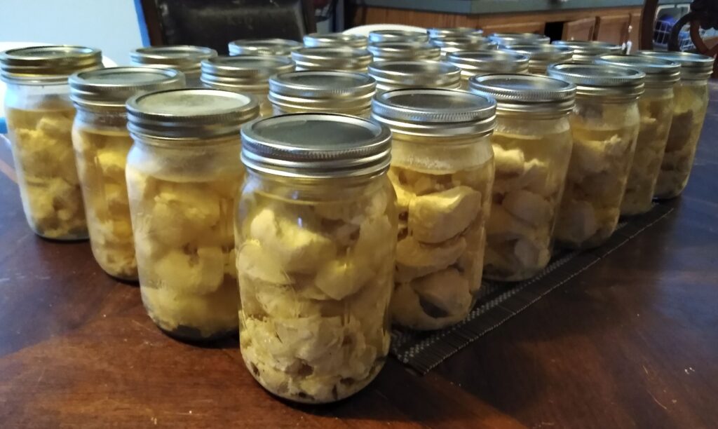 This was one of the most successful things I have ever canned. 60 pounds of boneless chicken fills 24 quart jars. 🙂 It took 4 rounds in the pressure canner, at 1 1/2 hours each round! So it took 2 days to complete all 60 pounds. But at the end of it I had not only saved my chicken, but filled my canning shelves! 😀